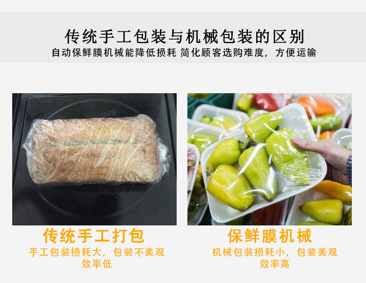 適用于各種保鮮膜(PVC/PE),可采用國產進口,節(jié)省成本;一些國外設備只能使用進口保鮮膜。